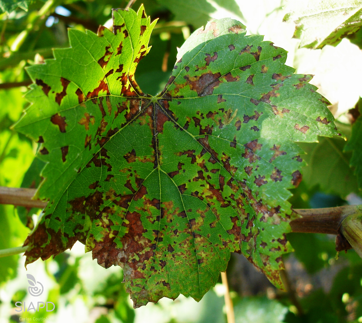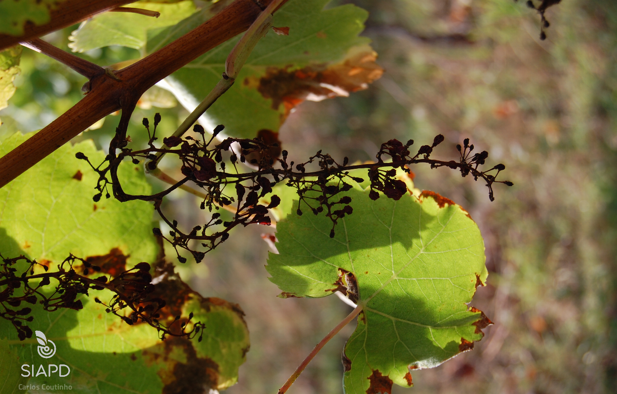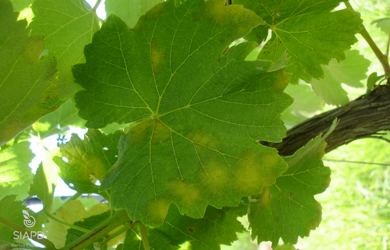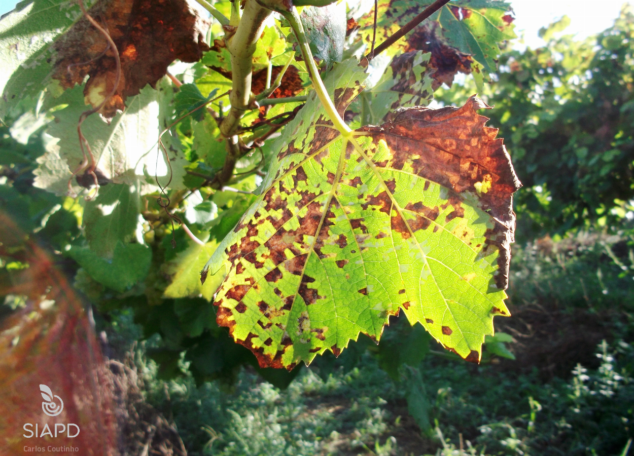 Os sintomas que P. viticola provoca na videira variam com o ciclo vegetativo da videira (Agrios, 2005).
