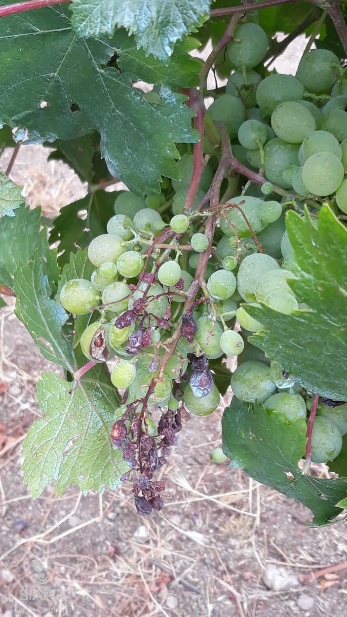 A infecção pelo míldio pode também ocorrer nos bagos, contudo, estes com o amadurecimento vão ficando menos suscetíveis. Junto à fase de “grão de ervilha”, e posteriormente, quando o míldio se desenvolve surgem manchas arroxeadas que se transformam em necroses da pelicula e da polpa, surgindo marcas parecidas com o comprimir de dedadas. Os bagos podem ser totalmente invadidos, adquirindo uma cor acastanhada acabando por necrosar e endurecer. Este sintoma é designado por “rot brun”, observando-se nos bagos mais velhos, mas ainda antes do pintor. Quando ocorre este sintoma não há esporangióforos e por isso não se observa enfeltrados brancos. A doença nesta situação pode causar a destruição total dos bagos (Agrios, 2005; Amaro et al., 2001).